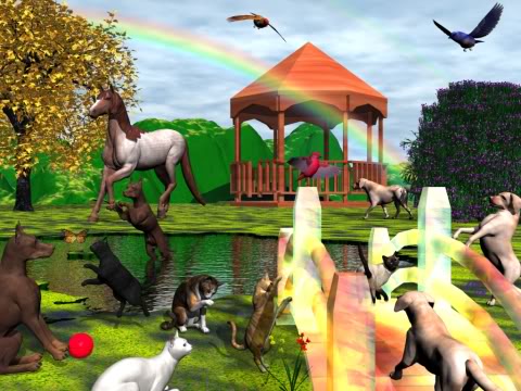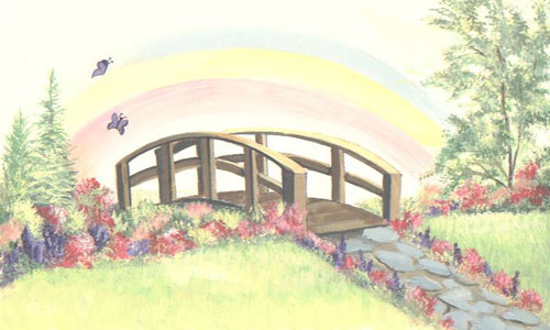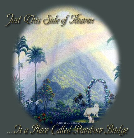 Just this side of heaven is a place called Rainbow Bridge. When an animal dies that has been especially close to someone here, that pet goes to Rainbow Bridge. There are meadows and hills for all of our special friends so they can run and play together. There is plenty of food, water and sunshine, and our friends are warm and comfortable. All the animals who had been ill and old are restored to health and vigor. Those who were hurt or maimed are made whole and strong again, just as we remember them in our dreams of days and times gone by. The animals are happy and content, except for one small thing; they each miss someone very special to them, who had to be left behind. They all run and play together, but the day comes when one suddenly stops and looks into the distance. His bright eyes are intent. His eager body quivers. Suddenly he begins to run from the group, flying over the green grass, his legs carrying him faster and faster. You have been spotted, and when you and your special friend finally meet, you cling together in joyous reunion, never to be parted again. The happy kisses rain upon your face; your hands again caress the beloved head, and you look once more into the trusting eyes of your pet, so long gone from your life but never absent from your heart. Then you cross Rainbow Bridge together.... Never again to be apart. Author unknown...